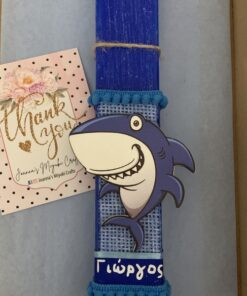 Μπλε ξυστή αρωματική λαμπάδα 23 εκατοστά με εντυπωσιακό ξύλινο στοιχείο Καρχαρίας. Η λαμπάδα έχει υπέροχο άρωμα.