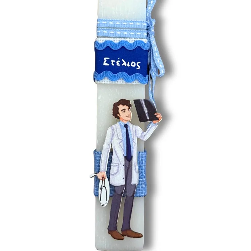 Λευκή αρωματική λαμπάδα 23 εκατοστά με εντυπωσιακό ξύλινο στοιχείο Άνδρας Γιατρός με όνομα.