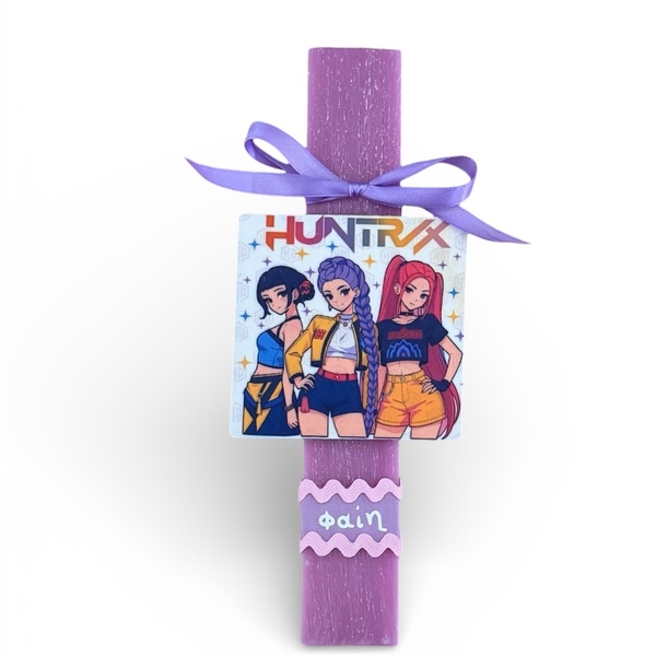 Μωβ αρωματική λαμπάδα 23 εκατοστά με εντυπωσιακό ξύλινο στοιχείο Huntrix – Kpop Demon Hunters με όνομα.
