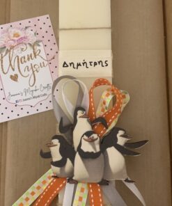 Εκρού αρωματική λαμπάδα 25 εκατοστά με εντυπωσιακό ξύλινο στοιχείο Πιγκουίνοι της Μαδαγασκάρης. Η λαμπάδα έχει υπέροχο άρωμα.