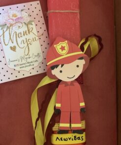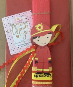 Αρωματική λαμπάδα 23 εκατοστά με εντυπωσιακό ξύλινο στοιχείο Πυροσβέστης. Η λαμπάδα έχει υπέροχο άρωμα. Φτάνει σε εσάς με ασφάλεια, δεμένη μέσα σε υπέροχο κουτί δώρου, έτοιμη να τη χαρίσετε στους αγαπημένους σας.
