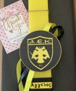 Κίτρινη ξυστή αρωματική λαμπάδα 23 εκατοστά με εντυπωσιακό ξύλινο στοιχείο με την αγαπημένη του ομάδα. Η λαμπάδα έχει υπέροχο άρωμα.