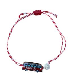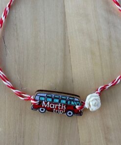 Μαρτάκι με ξύλινο στοιχείο λεωφορείο Martis trip και λευκό τριαντάφυλλο. Μέγεθος κατάλληλο για ενήλικες και παιδιά. Φτάνει σε εσάς σε συσκευασία δώρου.