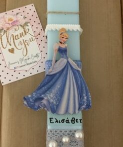 Γαλάζια αρωματική λαμπάδα 23 εκατοστά με εντυπωσιακό ξύλινο στοιχείο Σταχτοπούτα. Η λαμπάδα έχει υπέροχο άρωμα.